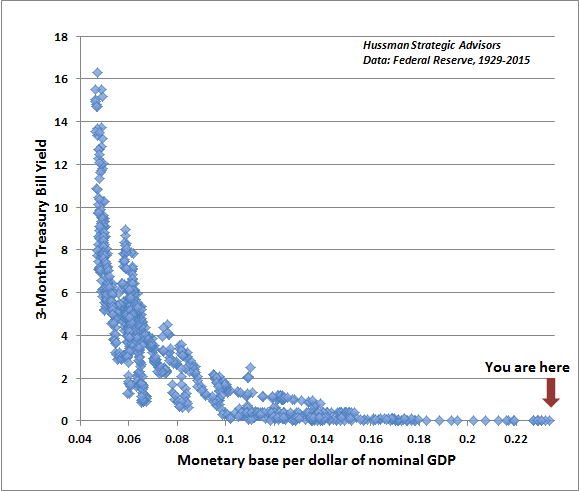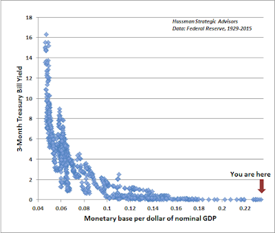- John Hussman has a graph showing how extreme the current conditions of low interest rates, high money supply, and low velocity of money are: